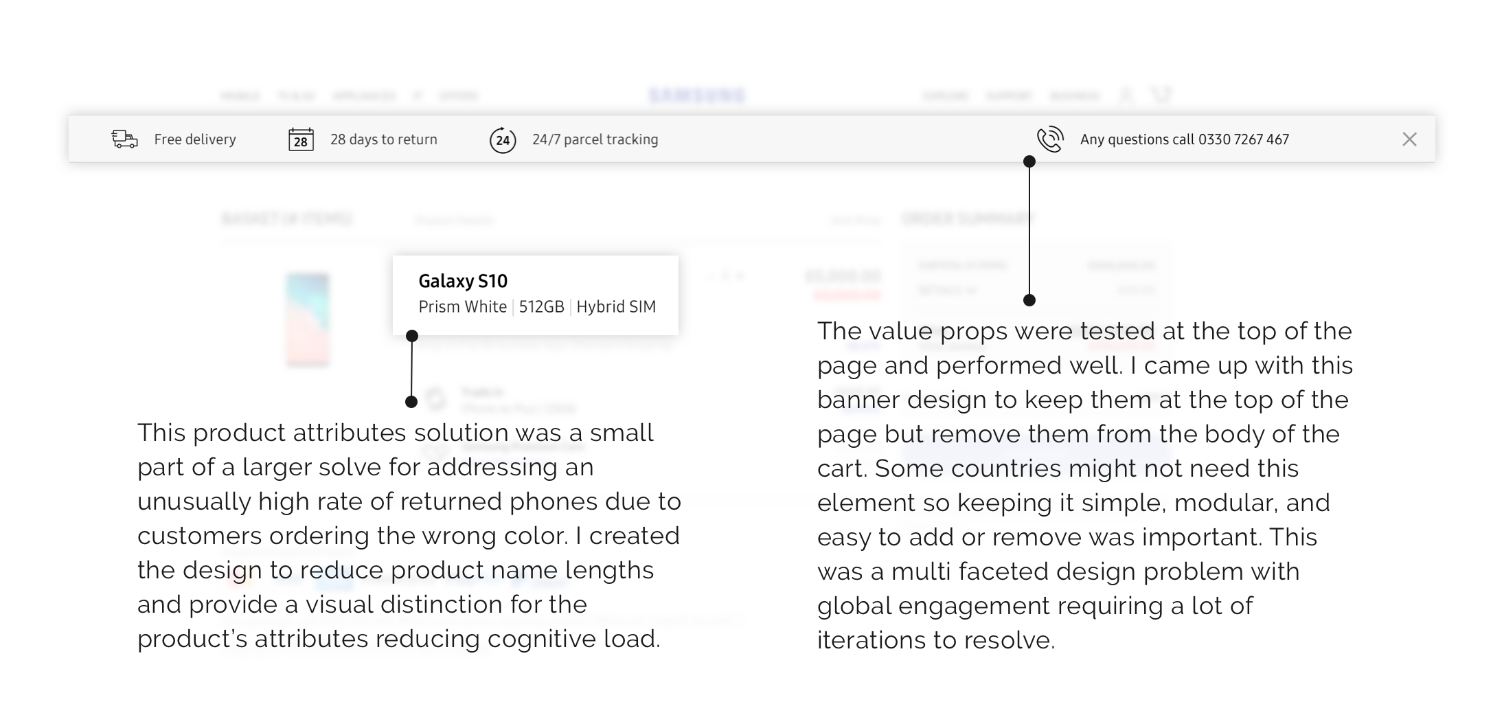 I came up with a number of solutions to customer and business problems within the updated shopping cart design. I’ve called out a couple below to illustrate my work.